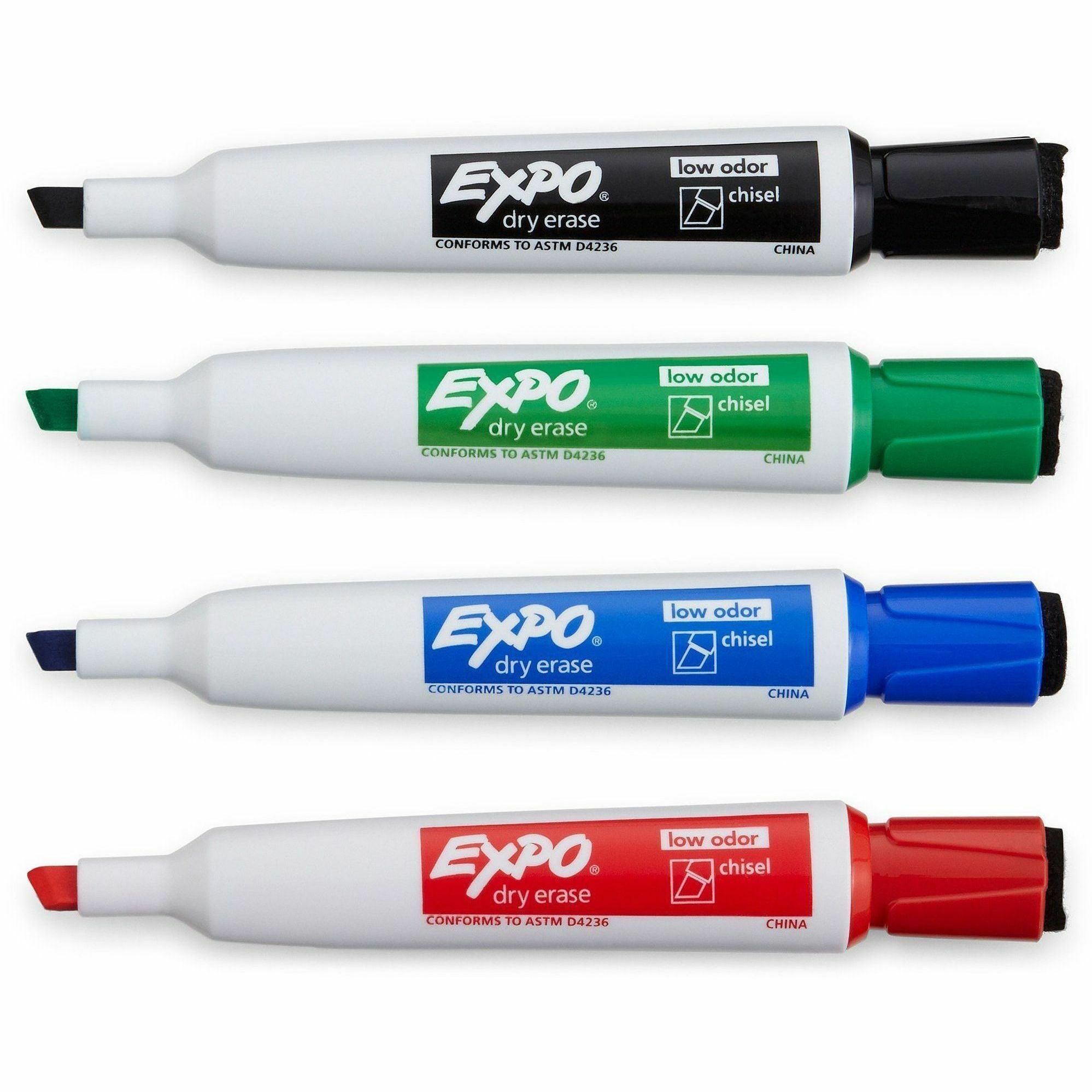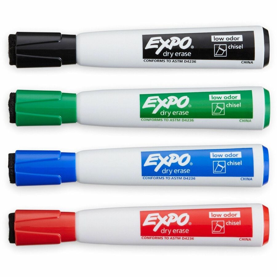 | Marketing Information | Keep your dry-erase markers locked and ready on any metal surface with Magnetic Dry-Erase Markers. Integrated magnet in these EXPO markers provides convenient storage on metal-backed whiteboards, refrigerators and other metal surfaces. Cap features a handy EXPO eraser for precise and easy erasing. With ink more vibrant than ever, these markers help you capture ideas, share information and organize life in vivid color. Versatile chisel tip creates multiple line widths. Markers are perfect for planning, presentations, lessons, calendars, home organization and more. |