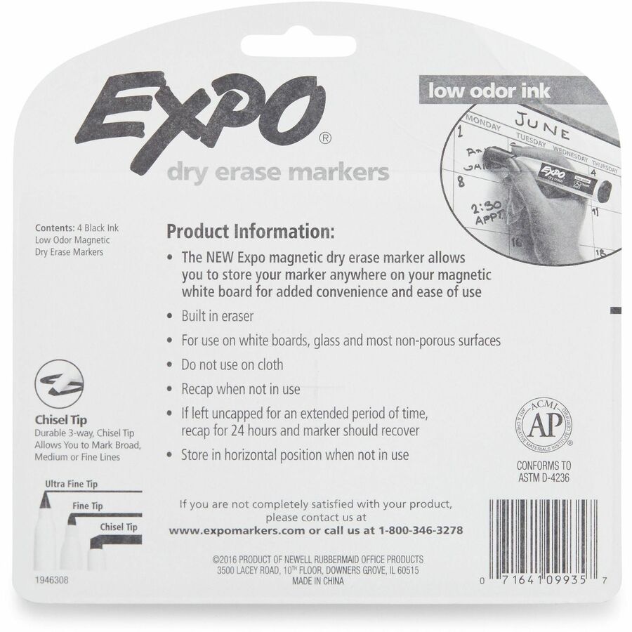 | Marketing Information | Keep your dry-erase markers locked and ready on any metal surface with Magnetic Dry-Erase Markers. Integrated magnet in these EXPO markers provides convenient storage on metal-backed whiteboards, refrigerators and other metal surfaces. Cap features a handy EXPO eraser for precise and easy erasing. With ink more vibrant than ever, these markers help you capture ideas, share information and organize life in vivid color. Versatile chisel tip creates multiple line widths. Markers are perfect for planning, presentations, lessons, calendars, home organization and more. |
