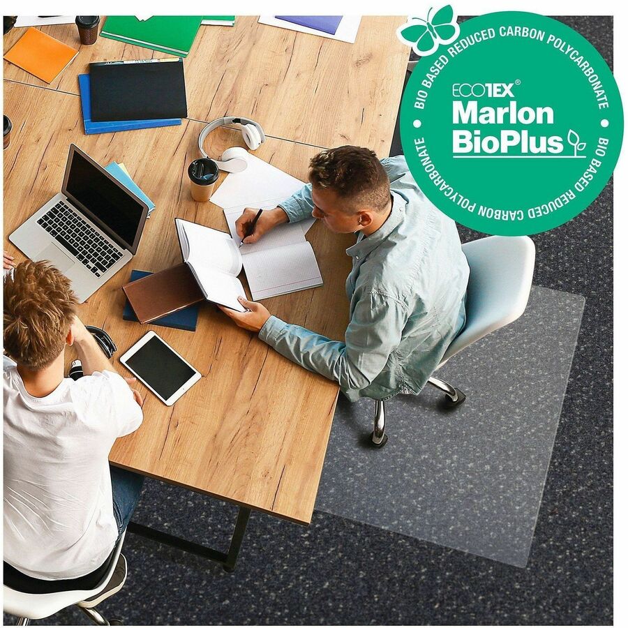 | Marketing Information | Ecotex Marlon BioPlus Polycarbonate Chairmat provides the ultimate quality, function and durability combined with eco-friendly, nonfossil-based material. It is produced using a Mass Balancing bio-circular process for a reduced impact on the environment. Both the resin and chairmat are manufactured as ISCC (International Sustainability and Carbon Certification). With twice the impact strength of PVC, the perfectly flat and rigid material provides an ergonomic, easy-glide surface for casters on chairs, helping reduce leg fatigue and lower back strain. Chairmat is intended for use on carpet and is guaranteed not to crack, curl, discolor or smell. It is free of phthalates, PVC and toxic chemicals and is an ideal choice for people with allergies. |