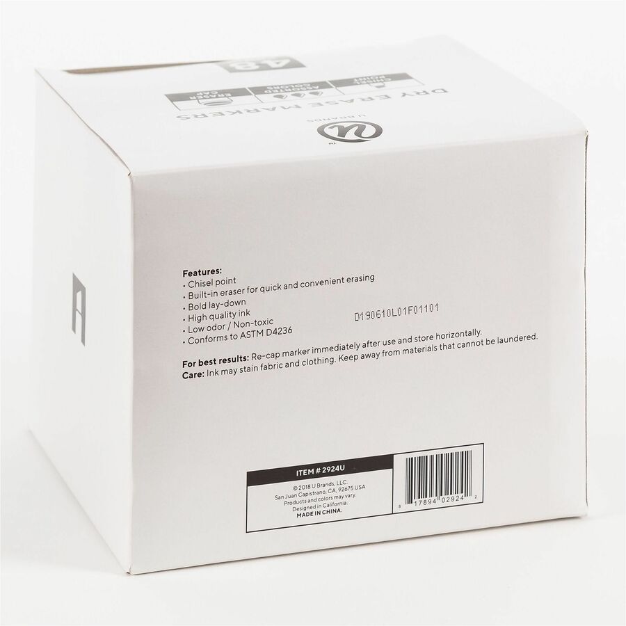U Brands chisel tip dry erase markers feature bold and vibrant color inks that dry quickly, erase easily, and work great on any dry erase board surface. The markers also feature long-lasting, non-toxic, low odor ink that is great in any classroom, home, or office environment. This dry erase marker value pack features 48 markers in essential core colors. The dry erase markers feature a chisel tip for a bold and precise writing experience on any melamine, painted steel, porcelain, or glass dry erase surface. The built-in felt eraser into the marker cap enables quick, convenient, and precise erasing. For best results, re-cap the marker immediately after use and store horizontally. |