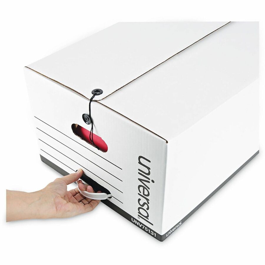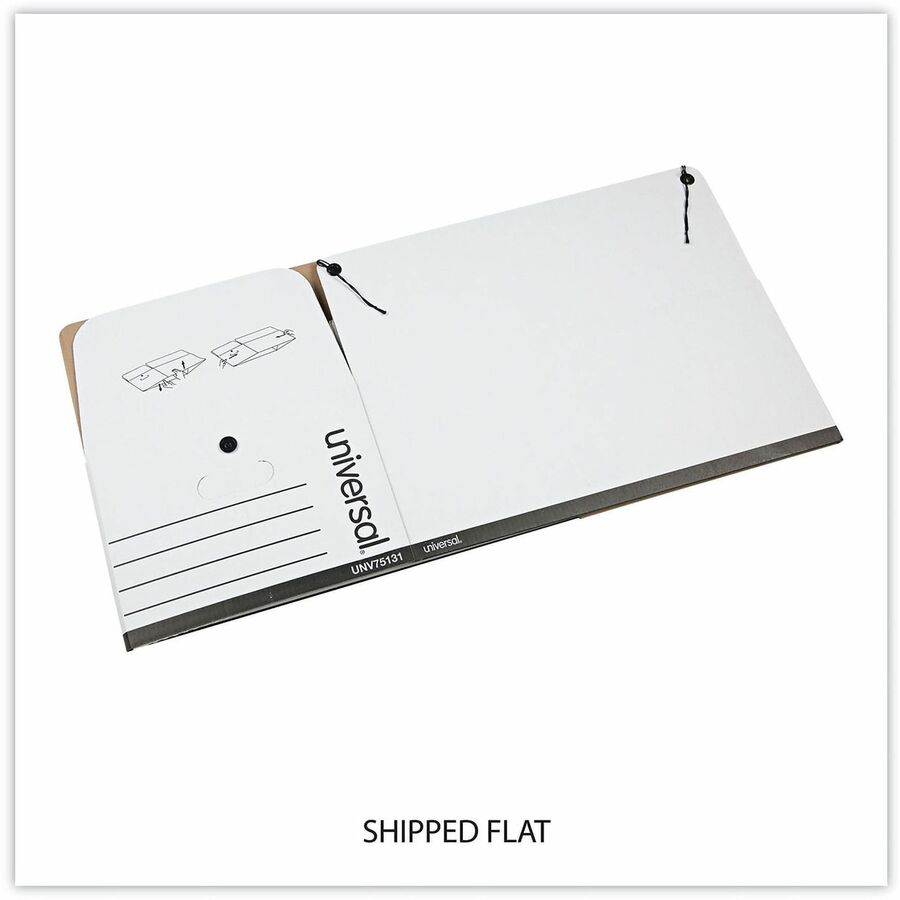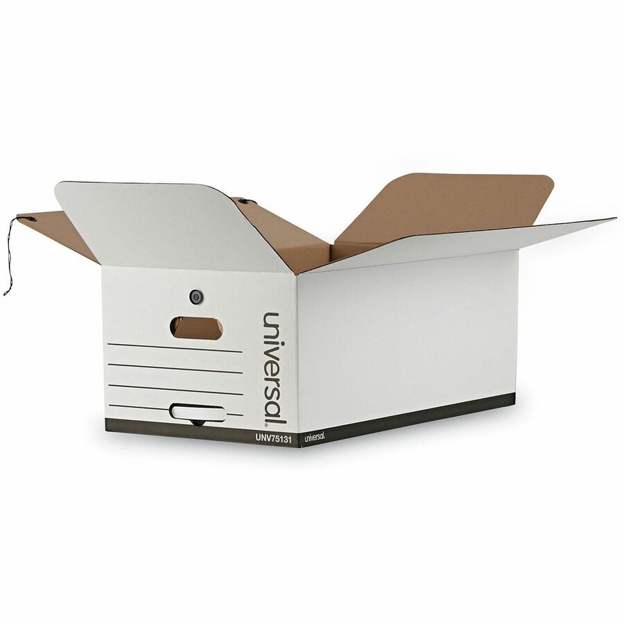 | Marketing Information | Universal® Deluxe Quick Set-up String-and-Button Boxes are ideal for storing heavy files and keeping documents organized. The sturdy, corrugated construction adds strength and value. Equipped with a string-and-button tie closure, you can securely store box contents and not worry about them tipping over and spilling out. Save assembly time with this light-duty box. Great for archiving and storing files and documents on storage racks, file cabinets, or other flat surfaces. |